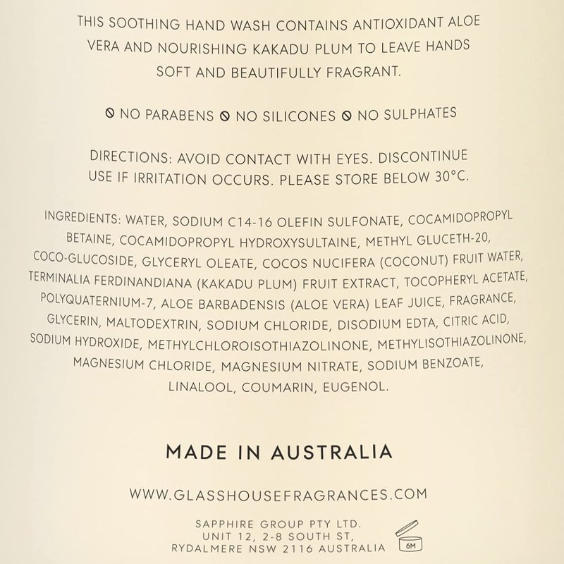 - CLEANSING, SOOTHING & MOISTURIZING: Our liquid hand soap is enriched with Aloe Vera for its antioxidant, soothing and moisturizing properties, Kakadu Plum Extract (rich in Vitamin C) to soothe the skin, Coconut Fruit Water to leave your hands feeling cleaner and hydrated, and Vitamin E Acetate for added antioxidants.