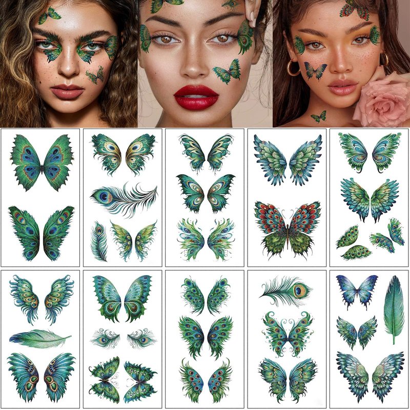 - fake butterfly temporary tattoos has10 sheets different butterfly wings Peacock Feather patterns you can used these tattoos for face eyes,neck and worn any where on your body show your personality Create the popular butterfly makeup on the InternetWear our butterfly Peacock Feather tattoos whenever and wherever you want The tattoos stickers for birthday party supplies daily life party favors goodie bags stuffers family party school event musical festivals rave night Christmas etc