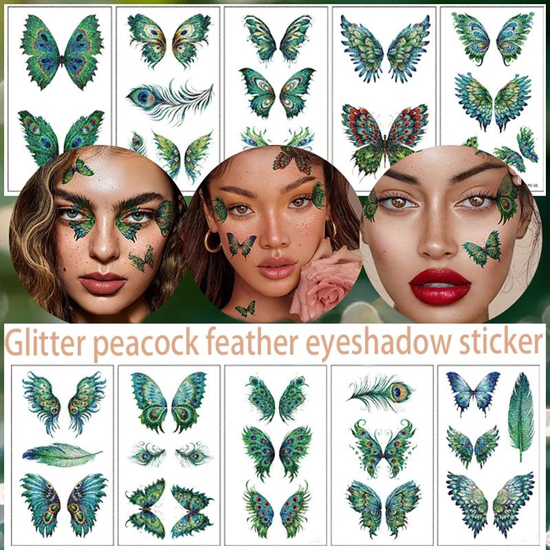 Glitter Butterfly Peacock Feather Waterproof Temporary Tattoo Sticker for Women Wings Fake Tattoo Stickers Face Eye Makeup Birthday Party Favors 10 sheets