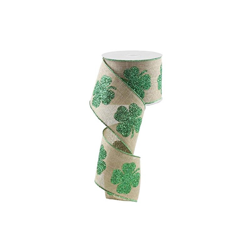 At 2 1/2" inches wide and 10 yards long you'll find so many uses for this decorative St Pattys ribbon. Glittery Emerald Green Four Leaf Clovers on natural colored faux burlap with soft wired edges. This 100% Polyester Ribbon is great for decorating Saint Patrick's Day gifts, trees, stairs, railings, tables, chairs, candles, doorways, parties, wreaths, swags, and more. Show your St Paddys Day spirit by decorating your home, yard, car and office.
