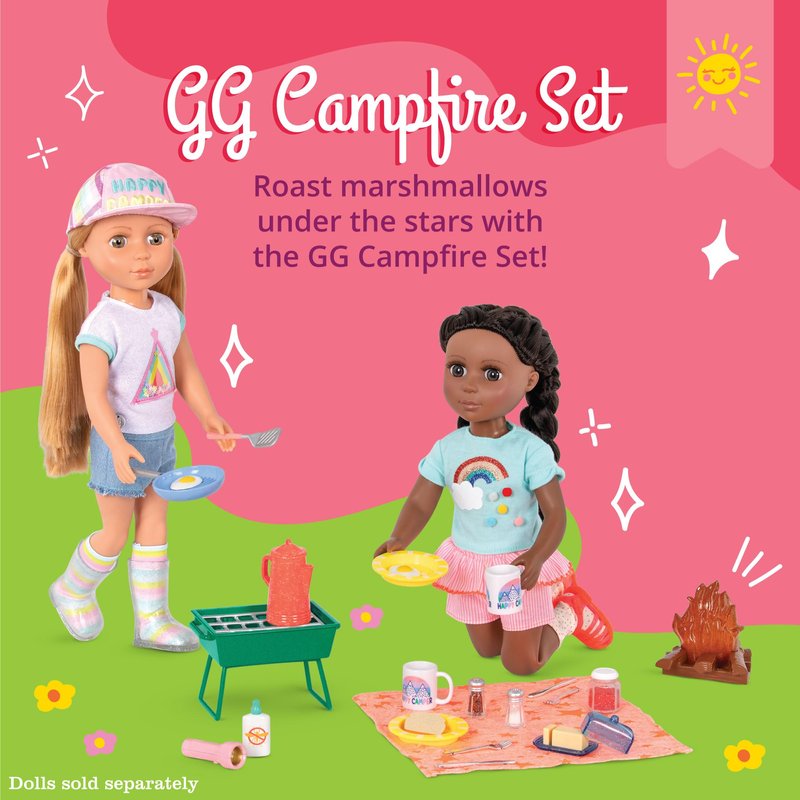 - Realistic details: marshmallows slide onto the toasting sticks; handles fit Glitter Girls doll's hands to toast marshmallows over the campfire!