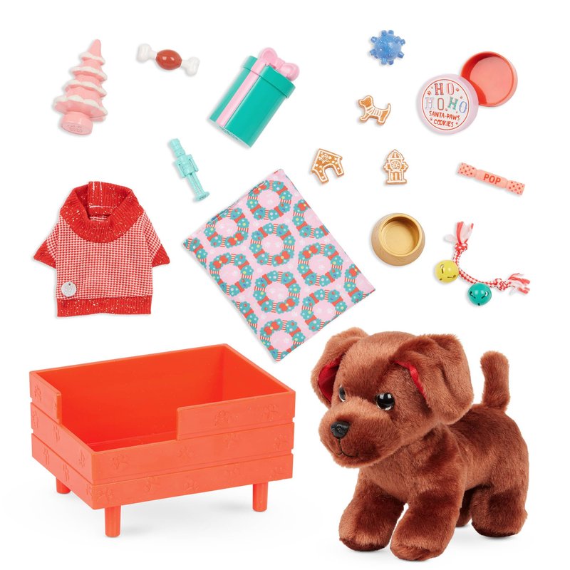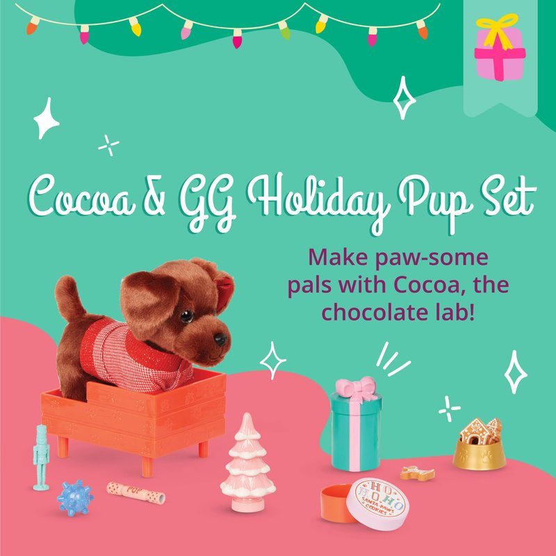 - Warm Up with Cocoa: Bring Cocoa home for the holidays with a festive holiday pup playset with accessories for cuddling and celebrating together! (Dolls sold separately).
