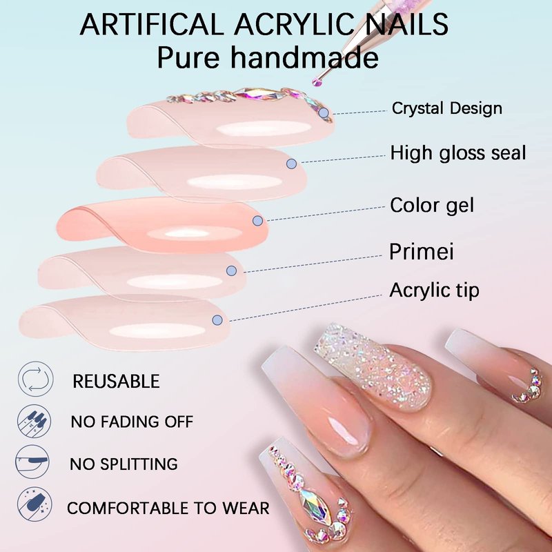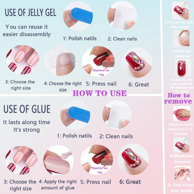 - 💎Glue on nails long-you can use our nail gel stickers and the fake nails can be reused. If you want to last long, please use our liquid nail gel and the effect can last 1-2 weeks.