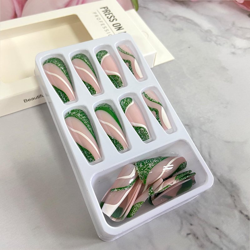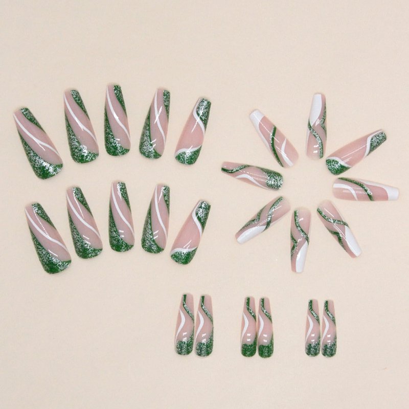 - 【Has Many Uses】Green white wavy lines false nails , extra long square shape. Perfect for nails salon, DIY home nails art,used on wedding ,prom party ,dating.It is perfect gift for girlfriends, wives, women and girls.