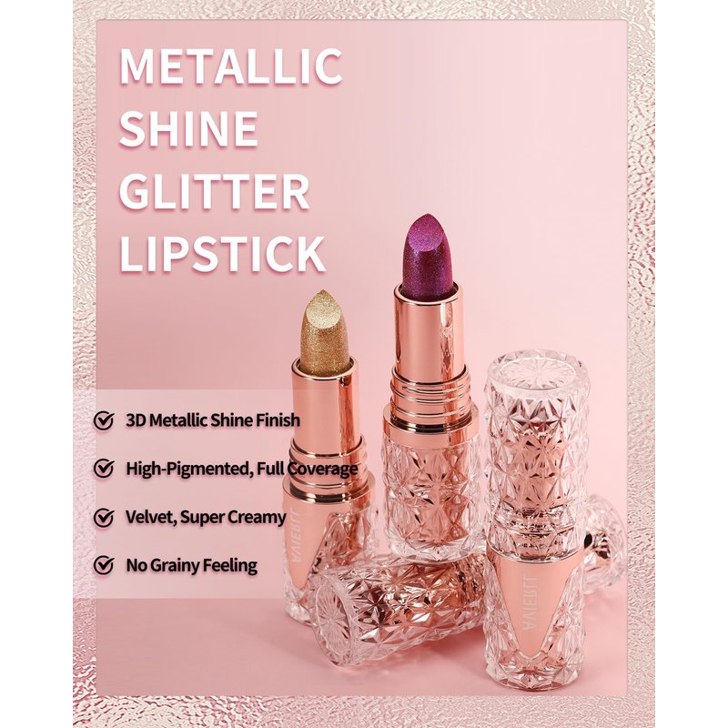 - Shimmer Metallic Lipstick - Glitter metallic lip stick is a moisturizing lipstick infused with shimmering sparkles combined with high pigments, provides bright and dazzling luster, and keeps you bright, waterproof and moisturizing all day long. It comes in 6 bold colors, each color with diamond shimmer glitter that meet your any occasion makeup need. A light application creates a subtle radiant lip look, while a thicker application showcases a metallic sheen.