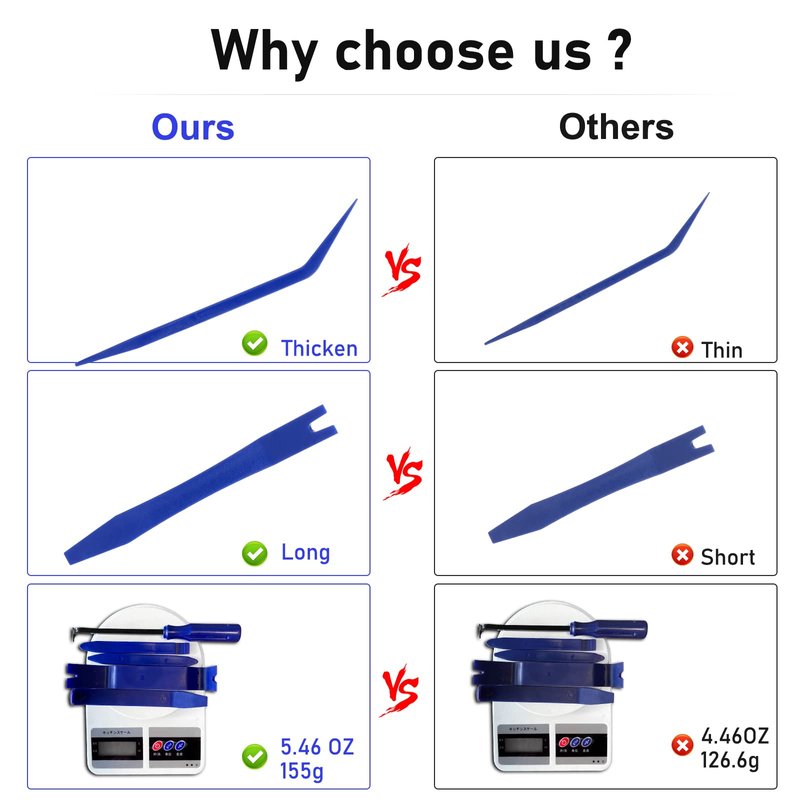 - Effective:The Plastic Pry Tool Kit with Different Design can Easily Remove Trim, Molding, Door Panels and Dashboards.