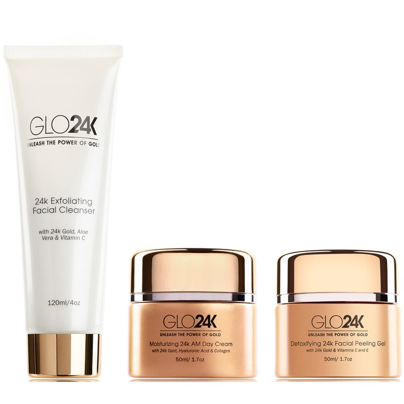 GLO24K 24k Gold Moisturizing Day Cream, Peeling Gel, Exfoliating Facial Cleanser Complete Set