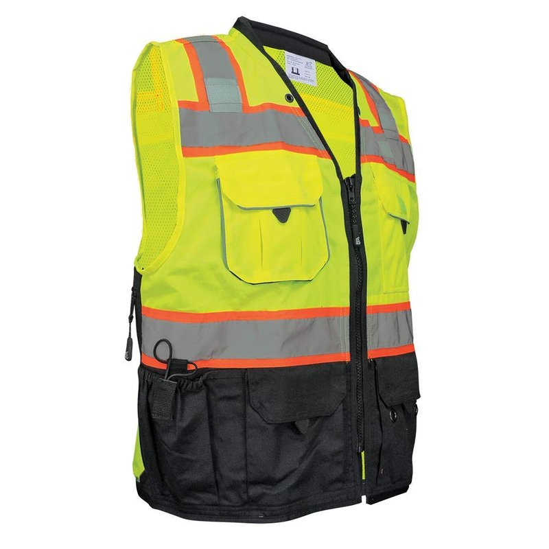 - High Visibility – This premium enhanced visibility surveyors safety vest features bright yellow/green material with contrasting orange trim, and 3M reflective lines on the front and back for enhanced visibility in low-light environments.