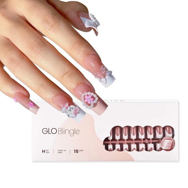 GloBlingle Pink White French Tip Press on Nails Long Square -150Pcs Gel Nails Tips Pretty Pink Kitty Bow Nails Art Decoration Kit Rhinestone Pearl Flower &UV Nail Glue Manicure DIY Valentine's Day Gifts for Women