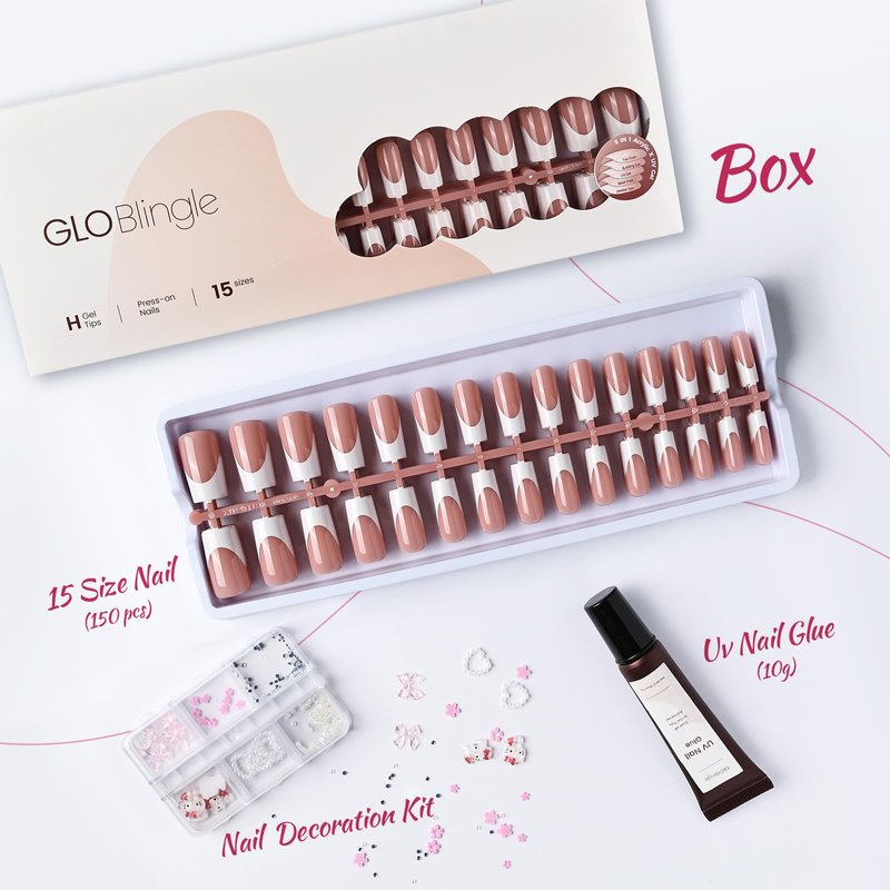 - 【What You Get】: Globlingle 5 IN 1 acrylic x uv gel Pretty Pink Collection press on nails kits with White French nail tips 3Packs (90Pcs,15 size), Pink French nails tips 2Packs (60Pcs,15 size), Nail art decoration kit (Hello kitty*6, Pink Bow*6, Heart Pearl*6,Nail Rhinestone, Pearl, Pink Flower ),10g soak off uv nail glue (can use as Rhinestone glue) ,you'll easily achieve a salon looking french pink gel nail polish mani and nail extension at home in 20 minutes.