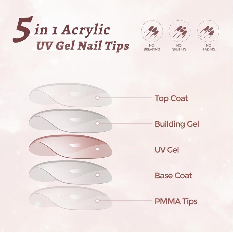 - 【5 IN 1 ACRYLIC X UV GEL NAIL TIPS】 These 5 in 1 Acrylic X UV Gel Nail Tips press on nails square short nail tips apply with pre-applied tip base coat , uv gel polish, building gel and top coat cover. Even beginners can easy and quickly to create salon-like nail within 15 mins or less! Saving lots of time and money both at home and salon.