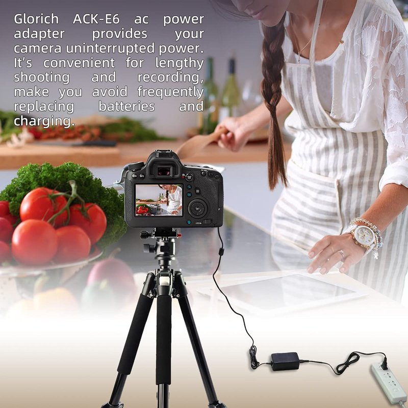 Glorich ACK-E6 replacement AC Power Adapter is designed to supply uninterrupted power for your camera while downloading pictures to your computer, for extended work in a studio, or while viewing images while connected to your TV or VCR, which doesn't require you to go through the authenticity check on the screen from time to time.