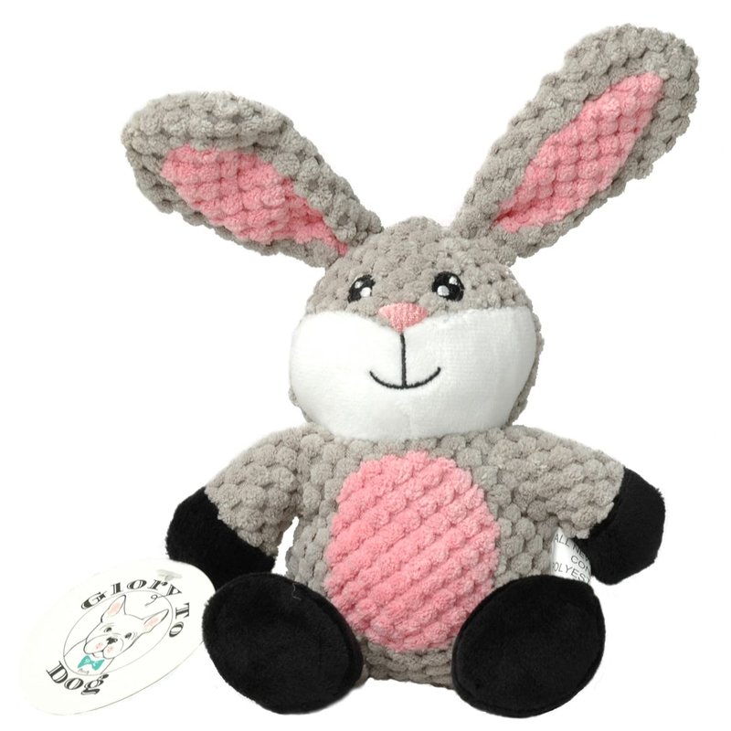 - Glory To Dog's Barnyard series reimagines the Rabbit a huggable toy for medium-sized dogs. The soft woven pineapple fabric texture is gentle on dogs' mouths, and the toy's multiple appendages make it easy to grab and shake. The toy is ideal for cuddling and snuggling, providing comfort to pups who love to snuggle with their toys. Made for energetic play with 100% safe, color-fast materials and no sharp or chewable plastic parts. Hand wash and air dry for easy cleaning.
