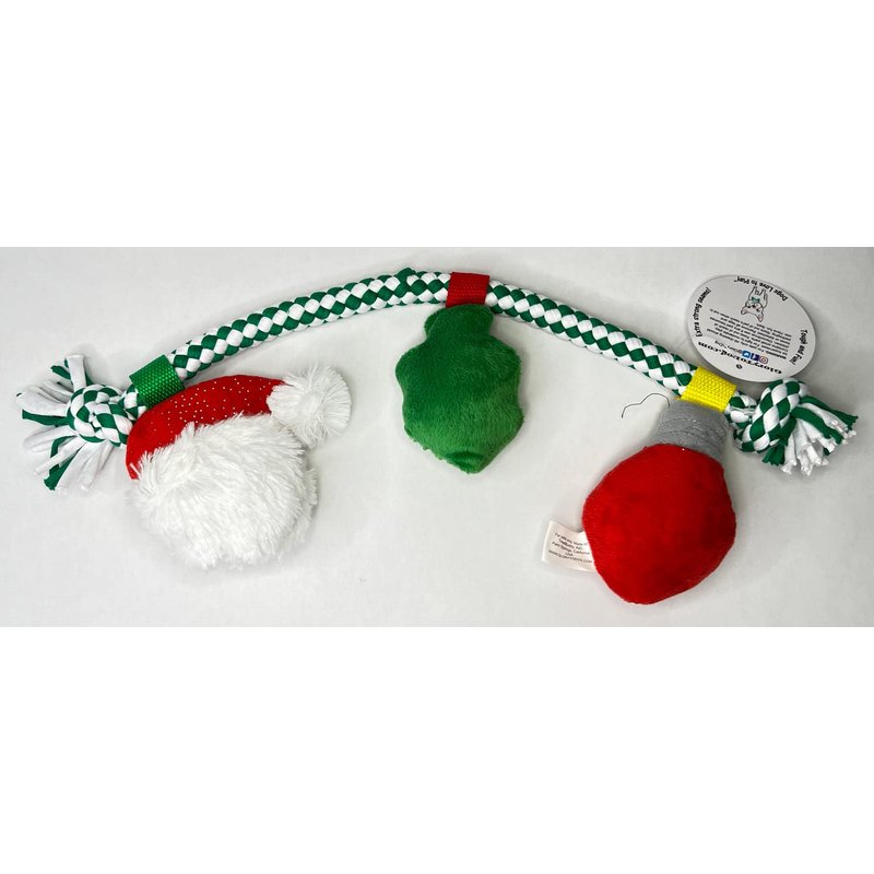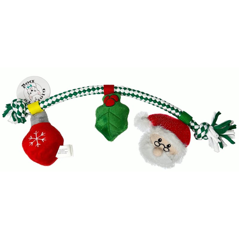 Everyone contributes to the family Christmas tree, and now your dog can play with his own strand of ornaments made out of soft plush with a squeaker in each, safely. The Christmas plushie has a bright red Christmas tree light bulb, a leaf of vibrant green mistletoe, and a Santa head with fur-trimmed cap bound to a green and white braided rope for holiday time tug-o-war, fetch and play. Rope toys are great for exercise and stimulation, satisfying dogs’ hunting and chasing instincts, while providing interaction, bonding and just plain fun. Rope toys are also excellent for cleaning teeth as the fibers separate and act like floss, but keep an eye on the toy and the chewer as no toy is indestructible.