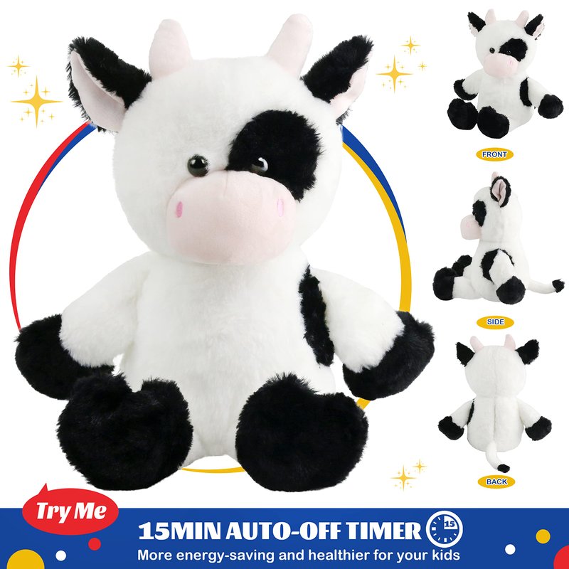 - INSTALL BATTERIES-Open the velcro on the back of the cow and open the battery box, install 3 AAA batteries, flip the little black button to ‘on’ and put the box back. Press the ‘♫’ button on the right of the cow plush body, it will sing, and press it again to change to the next song, press the lighting button on the left, it will glow , the lights will change to colorful after a few seconds, 15 minutes timer is installed.