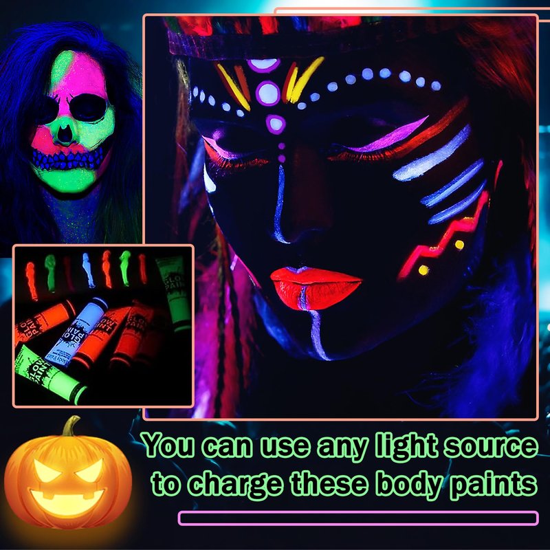 - Fluorescent Effect: Neon face paint is made with a unique formula that glows in any setting with a UV light, this neon body paint will spice up your Halloween costume and dress up, and show off your unique occasion charm even more
