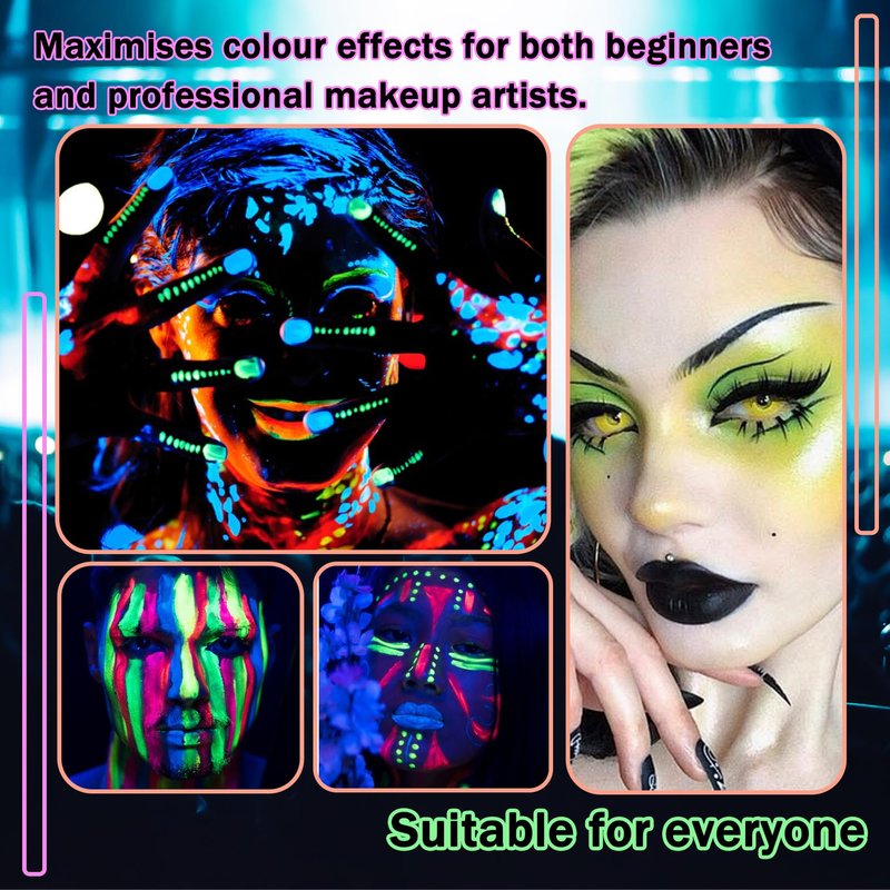 - Great Choice: You can create a variety of colorful and fun Halloween makeup that will make you sparkle under the UV lights and get you noticed at clubs, casuals, parties, dances and festivals