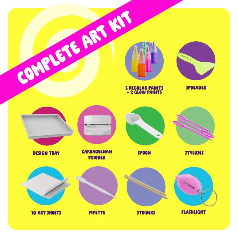 • COMPLETE ART KIT: Comes fully stocked with everything needed to start right away: art tray, 3 regular paints, 2 glow-in-the-dark paints, carrageenan powder, spreader, spoon, styluses, 10 art sheets, pipette, stirrers, and a flashlight to activate the glow effect.