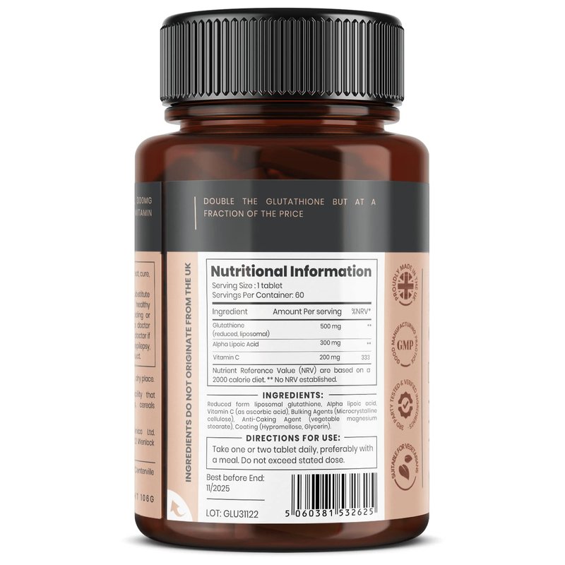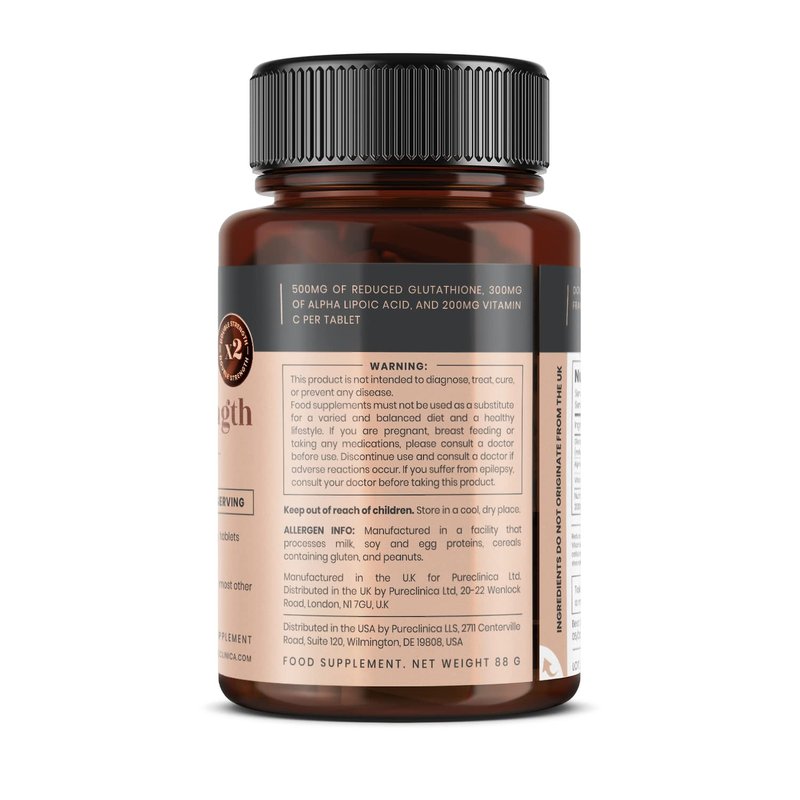 Double the Glutathione but a fraction of the high street price, 500mg of Reduced Glutathione, 300mg of ALA, and 200mg Vitamin C per tablet.