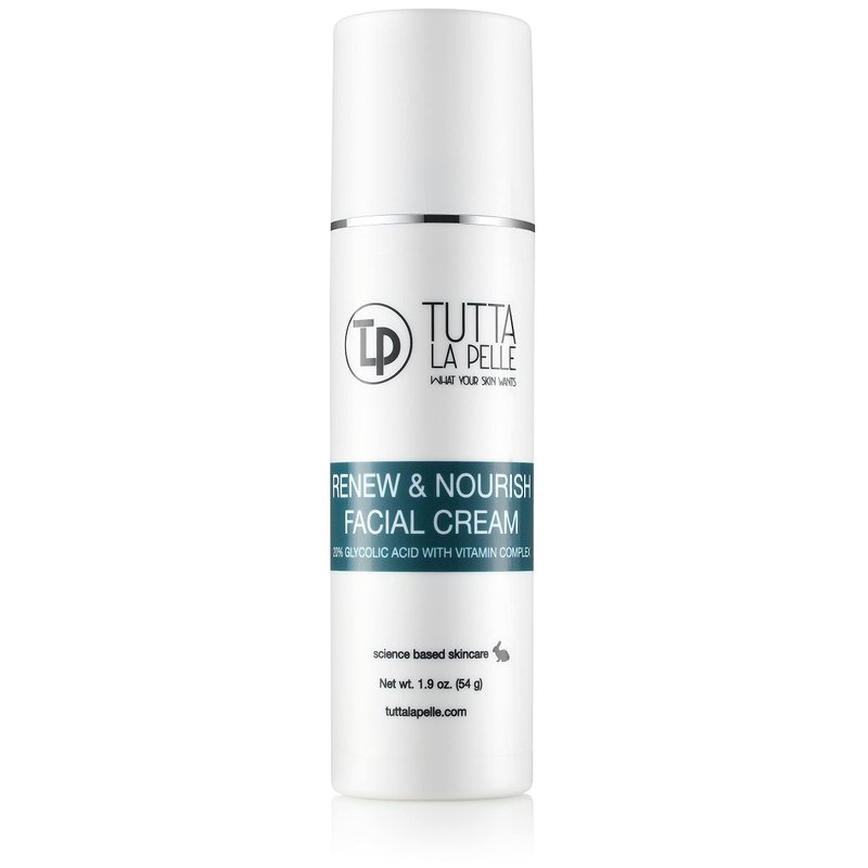 Tutta La Pelle’s Renew & Nourish Facial Cream is a cosmetically elegant anti-aging formulation with 20% glycolic acid, designed to stimulate cellular turnover rate and reveal fresher, healthier, younger-looking skin. This rich cream also includes vitamins A, C and E and green tea to provide superior antioxidant protection against further free radical-induced skin damage. You'll see rejuvenated skin with fewer fine lines, less discoloration and improved texture and tone.