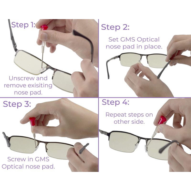 - Don’t waste time and money on new glasses. Use GMS Optical Screw-in nose pads to revive your frames and bring new comfort and life to your glasses!