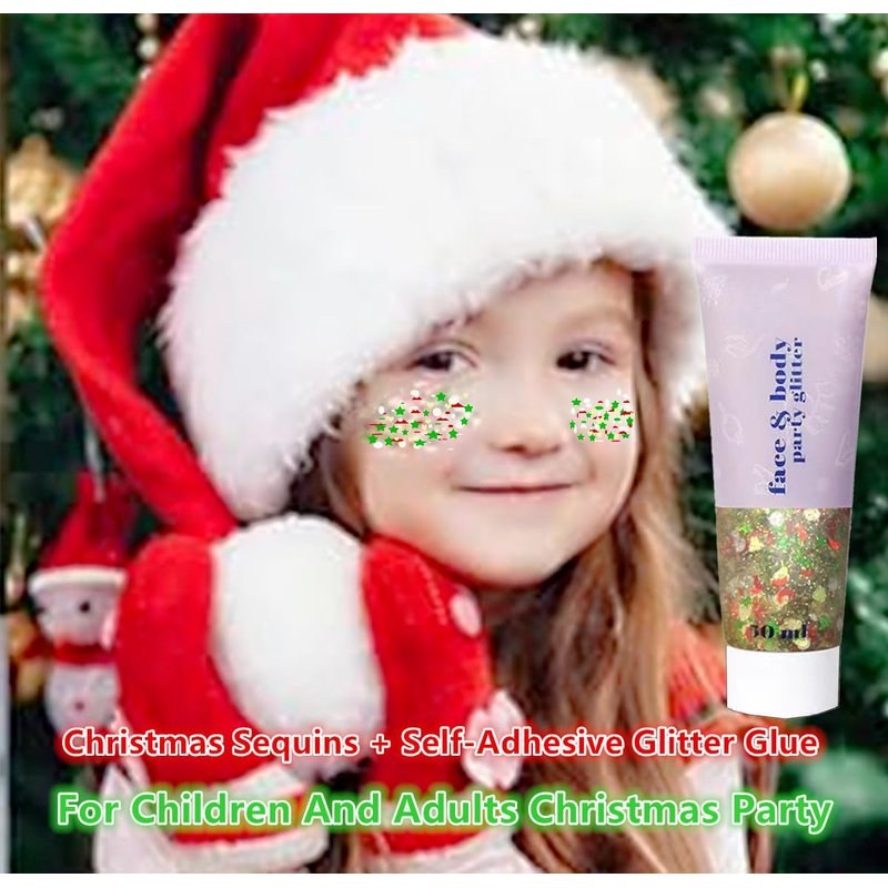 - 【Long Lasting Christmas Face Glitter Colorful Makeup】From Christmas Sequins and Self-Adhesive Glitter Glue mixed together.Under sun or light,the Christmas face glitter will shine like a rainbow. The iridescent clear glitter is amazing for club wear or cosplay, costumes, etc.Because of the sticky gel,a thin bit goes a long way.The flatter you lay it to skin the longer it holds.It takes a second to dry.After dried and it is set,it keeps shiny in the sun or light and will not drop at all.