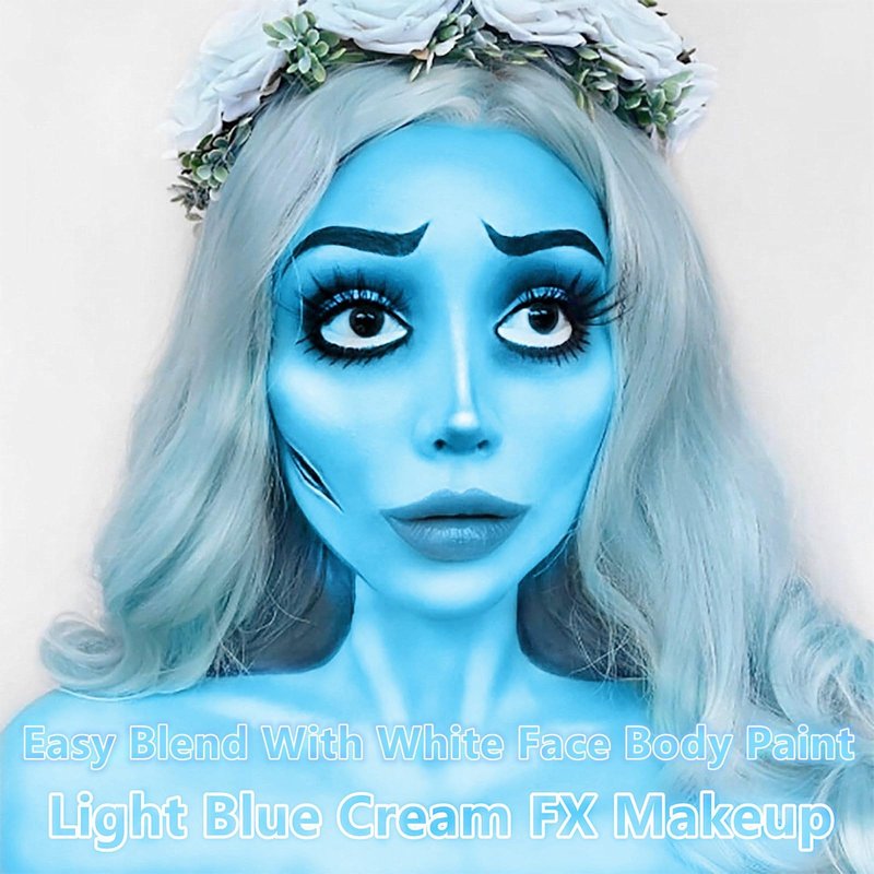 - 【Water Based Cream Light Blue Face Body Paint】Light Blue Face Body Paint Washable,perfect for Halloween Corpse Bride and Sally Makeup.Soft and moderate consistence.Nor too thick or too runny.Good coverage.Go on smooth.Easy to blend.Easy on and off.No cracks and flakes.No fading.No splotchy and patchy.No stains