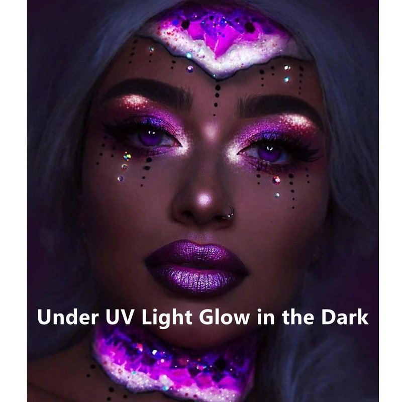 - 【Bright Colors Under UV Light Neon Body Paint】High pigment glow blacklight face body paint can use for eye ,face and body. Fit for fancy ball, parties, club,photoshoot, or night-out.Festival like Halloween,Christmas, New Year, Birthday, Valentine's Day,etc. NOTE:In the dark,our face paint does not glow unless under UV blacklights.