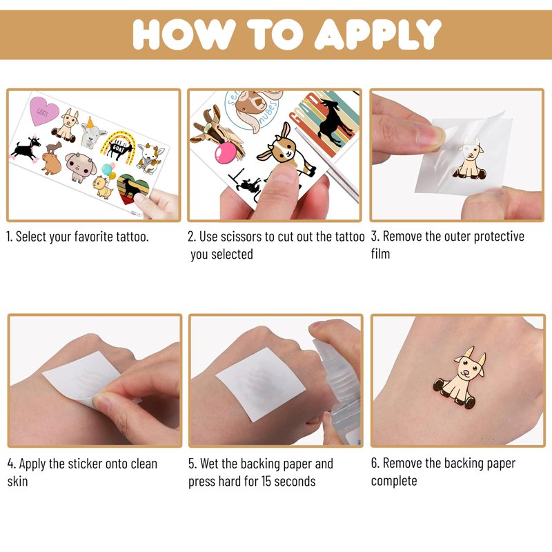 - Including eight sheets tattoos with various styles, sufficient in quantities and colors to meet your daily requirement of using and sharing. You guys can easily use this set of Cute Goat temporary tattoos and take unique photos to make fond memories.