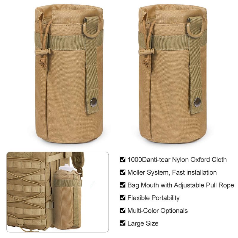 FEATURE 【Package Included】2 tactical pouches and Water Bottle Pouch Holder, can be attached to tactical vest, camping/ hiking backpack or other equipment with MOLLE system 【Size of Pouch】Approx 6"H x 5"L x 3"W, perfect for storing cell phone, tactical pen, keychain, GPS device, digital cameras, medical supplies or any necessary gadgets you need 【High Quality】The pouch is made of 1000D nylon material and the quality is better than most of the other 600D molle pouch. More wear-resisting and more durable 【How to Use】Molle pouch has 2 buckles on the back that can be attached as an extra external pouch to a tactical backpack, combat vest or other tactical gear, or even your suitcase, or can be used as a regular pouch PACKAGE INCLUDED 2 x Tactical Pouches, 1 x Water Bottle Pouch Holder