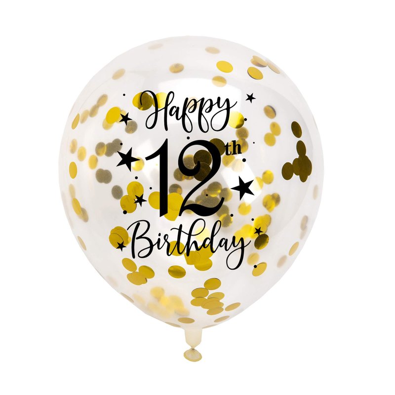 Gold 12th Confetti Latex Balloons, Girls or Boys Happy 12 Years Birthday Party Balloon Decoration With Confetti, 12in, 16 Pack