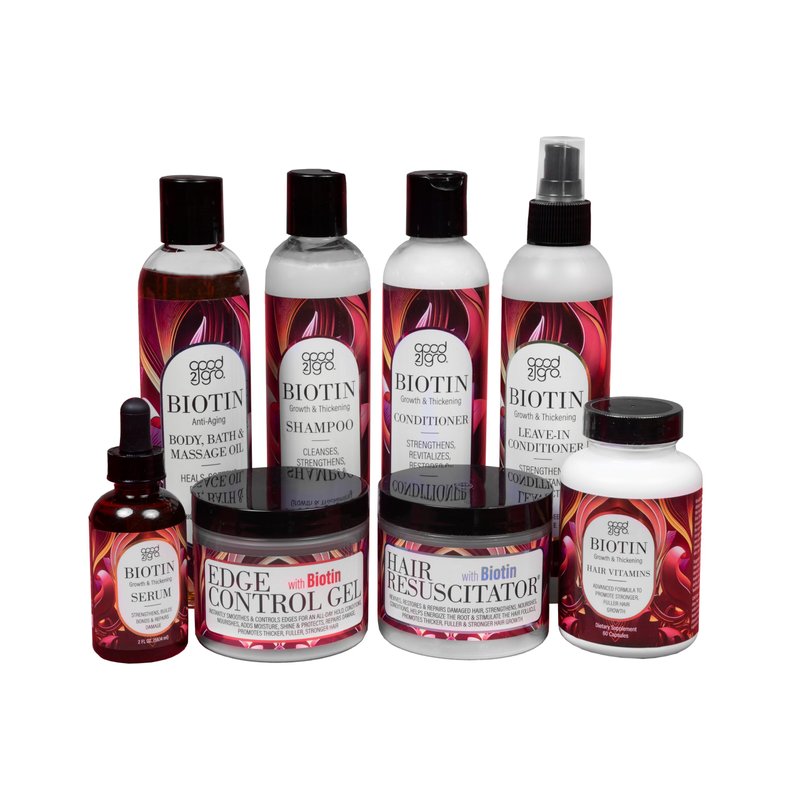 Good2Gro Biotin Hair Growth & Thickening Leave-In Conditioner is a plant derived formulation enriched with Biotin B7, Hydrolyzed Collagen and DHT inhibitors. Biotin and Collagen stimulate keratin production in the hair and increases hair follicle regeneration. Mango and Shea Butter are natural anti-inflammatories that improve scalp health and promote hair growth. Lightweight, conditioners build bonds to improve hair strength, thinning, and hair loss. Hydrates, moisturizes, nourishes, adds slip for easy detangling and comb thru. Repairs damage from the inside out, reduces breakage, smoothes the hair shaft, and protects strands from styling damage.