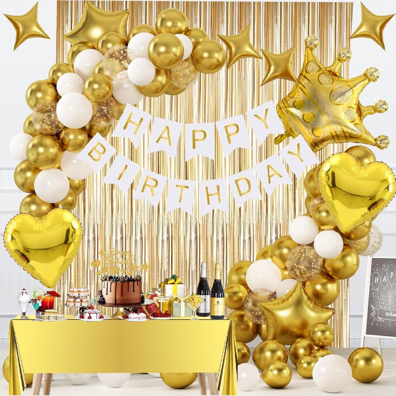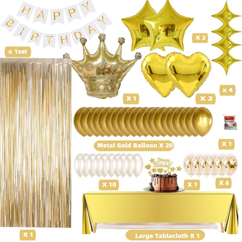 - Extensive Variety: This pack includes: 1 x “Happy Birthday” Banner 1 x Foil Fringe Curtains 1 x Gold Tablecloth 1 x Crown Balloon 4 x Star Foil Balloons 10 x White Balloons 20 x Gold Metal Balloons 6 x Gold Confetti Balloons 2 x Gold Star Balloons 2 x Gold Heart Balloons 1 Set Cake Topper Everything you need for a stunning celebration!