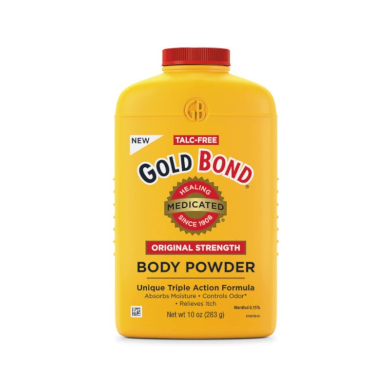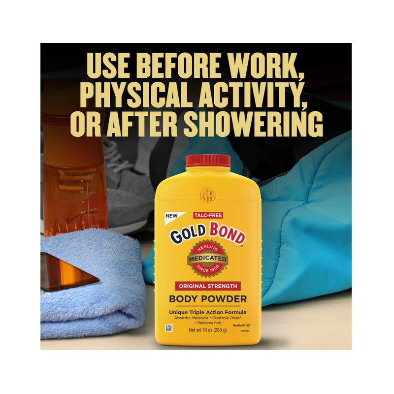 Skin that's sweaty and itchy deserves cooling relief. Gold Bond Medicated Talc-Free Body Powder's unique triple action formula absorbs moisture, controls odor* and is formulated with 0.15% menthol to help relieve itch. This original-strength body powder provides cooling relief and is ideal for itch associated with minor skin irritations, including sunburn, insect bites, scrapes, and minor cuts and burns. Best of all, this Gold Bond(R) Powder is gentle enough to use daily when used as directed. Stock up on 1-oz. bottles of Gold Bond Original Strength Medicated Body Powder and experience dependable itch relief when you need it most. Now talc-free and formulated without parabens and preservatives.