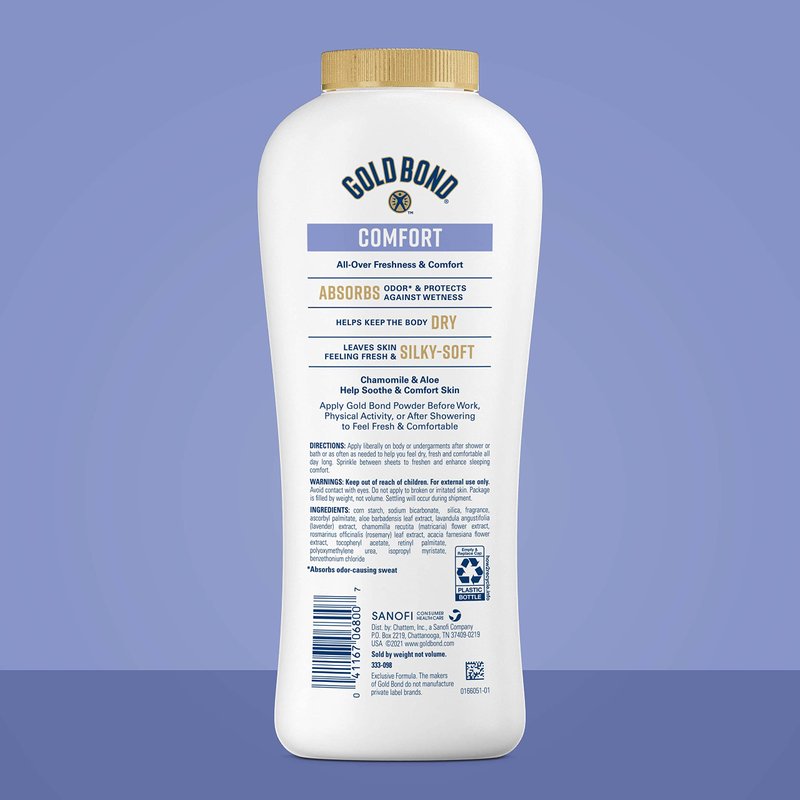 - Gold Bond Comfort Body Powder is made with chamomile and aloe and leaves skin feeling fresh and silky soft