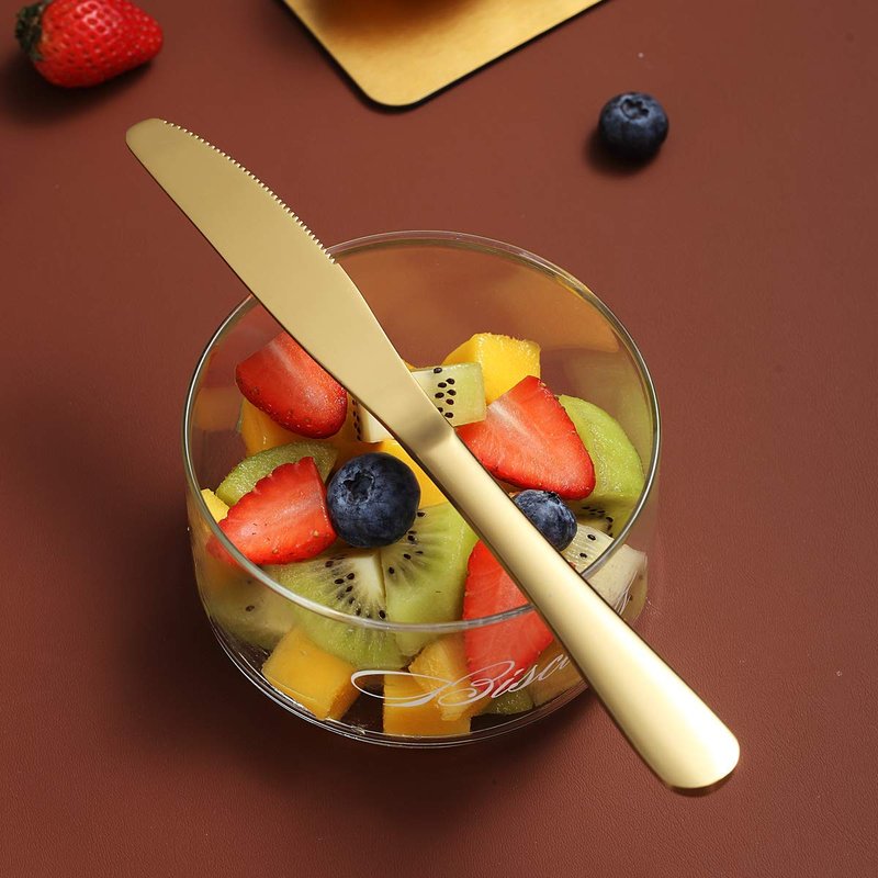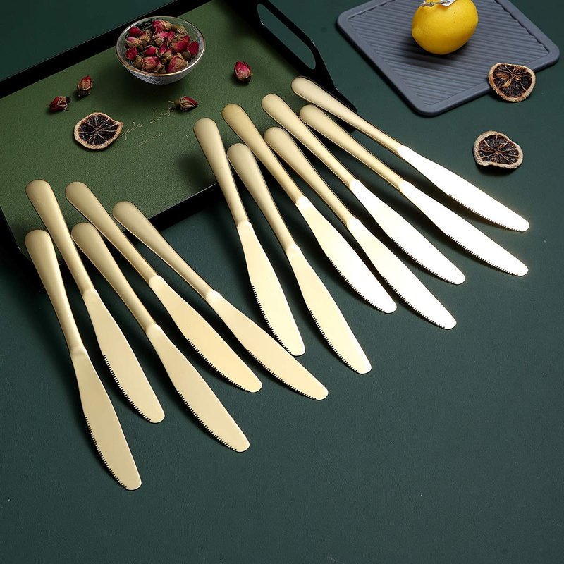 - Set of 12 stainless steel 7.9" titanium gold plating dinner knives, heavy duty and durable. Great for everyday use, hotel, restaurant, entertaining, holiday meal, parties, wedding, special event.