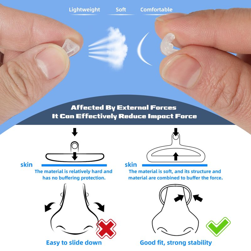 - Eyeglass Repair Tool Kit with Compact Accessories: 2 pairs of soft screw-in air bag nose pads are non-slip, lightweight and elastic. The airbag design let the nose pads to actively deform under the pressure of glasses to fit the nose. 1pair silicone ear hook for stable the glasses. The plastic tweezer is to grip the tiny screws. Please covering the glasses with the cleaning cloth to avoid scratching lens when operating.