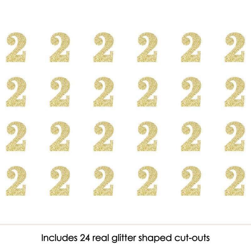 - Gold Glitter Number 2 Confetti INCLUDES 24 no-mess real gold glitter cut-out number 2s for a birthday party. Number 2 gold confetti is cut from no-mess glitter paper, making them perfect for table decorations and ensuring easy clean up.
