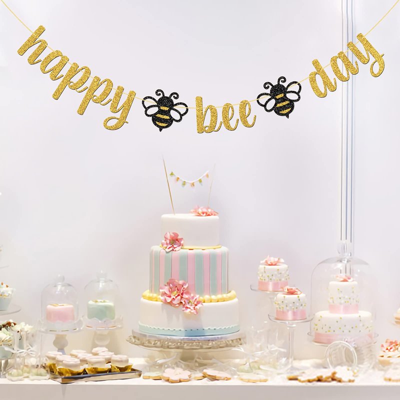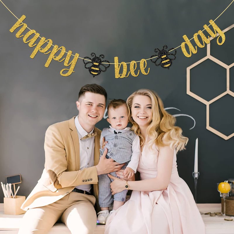 Gold Glitter Happy Bee Day Banner/Bumble Bee Theme Baby Shower Party Supplies/New Mom/Gender Reveal Party/Happy Birthday Party Decorations
