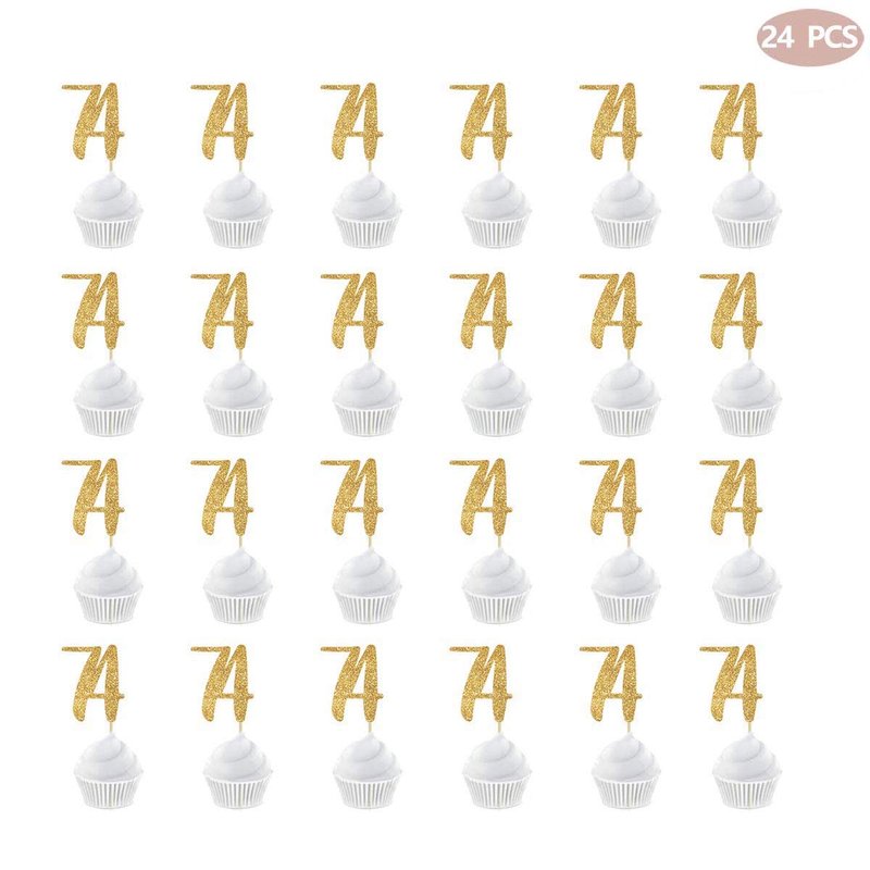 Gold Happy 74th Birthday Cupcake Topper, 24-Pack Number 74 Glitter Birthday Party Cupcake Toppers, Decorations