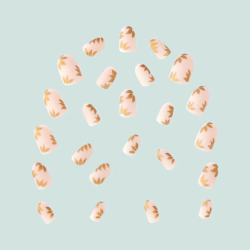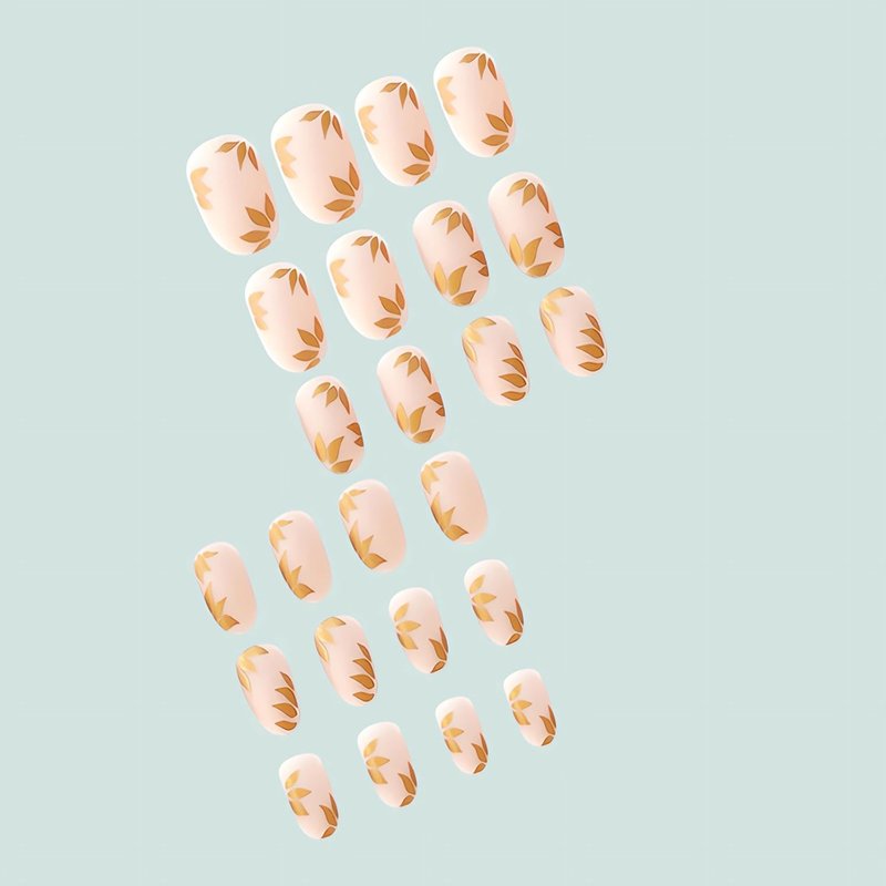 Gold Leaf Press on Nails Short Oval Fake Nails Golden False Nail Tips with Leaf Designs Full Cover Glue on Nails French Acrylic Nails Short Stick on Artificial Nails for Women Girls, 24Pcs