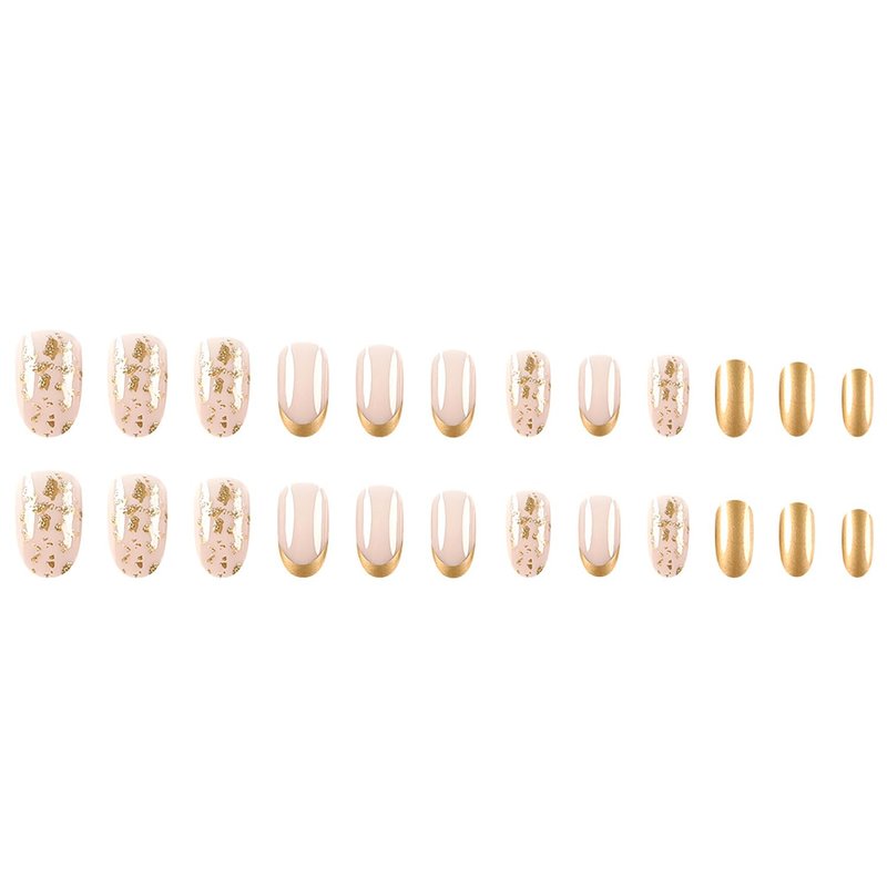 Gold Press on Nails French Tip Fake Nails Almond Nails Press on Gold Foil Designs False Nails Glossy Acrylic Nails Full Cover Glue on Nails Almond Shape French Tip Nails for Women Manicure, 24Pcs