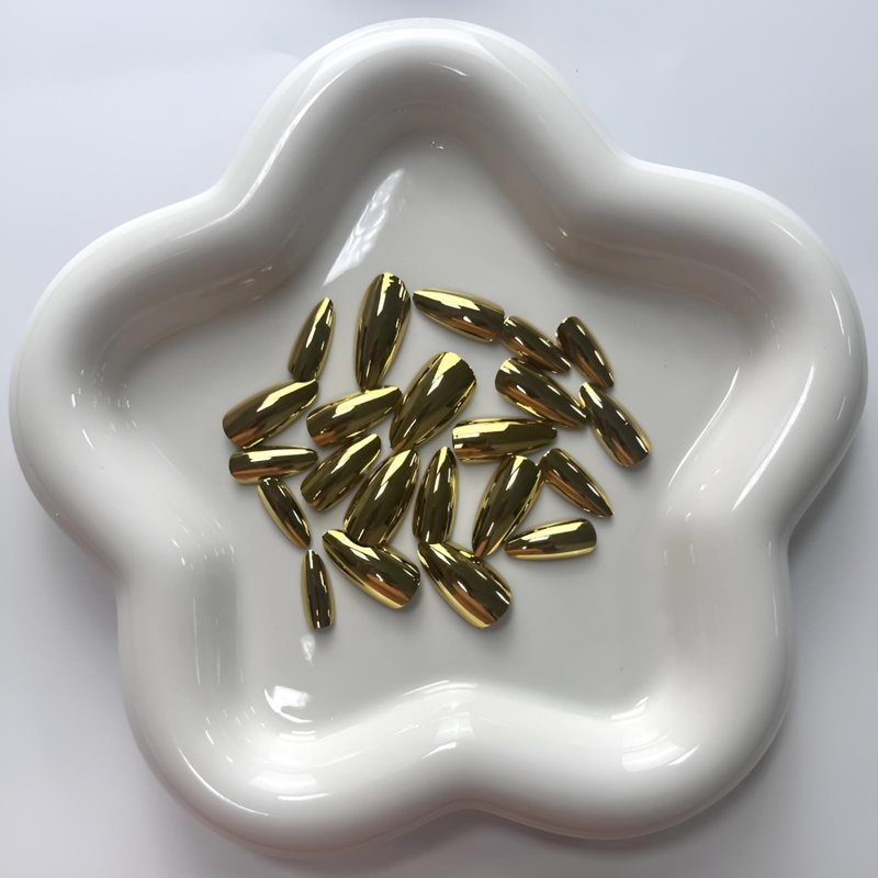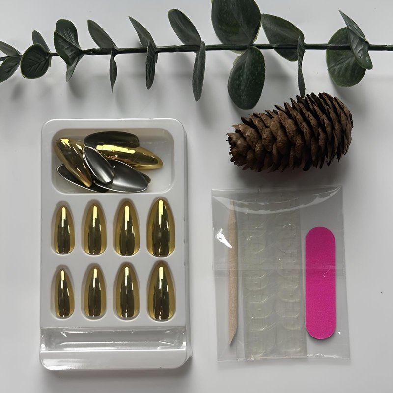 - 【Almond Press on Nails】The package contains 24 pieces of chrome gold fake nails of different sizes, 1 mini nail file, 1 small wooden stick, and 1 piece of nail glue sticker.You can safely choose a fake nail that fits your finger size and DIY your desired nail shape.
