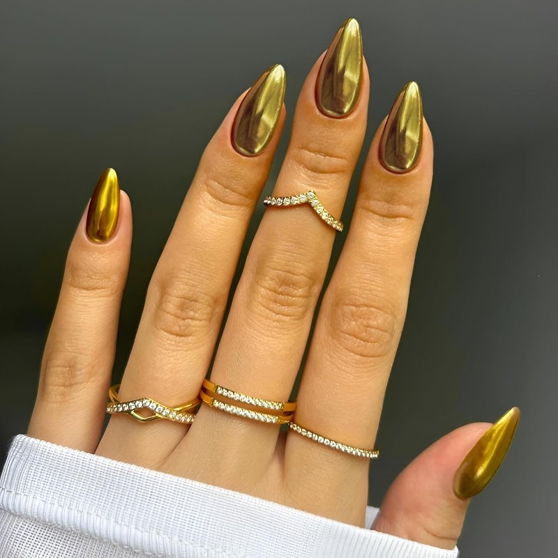 Gold Press on Nails Medium Almond Fake Nail Press ons Chrome Gold False Nails Acrylic Nails Shiny Glossy Full Cover Glue on Nails Stick on Nails for Women Girls 24 Pcs