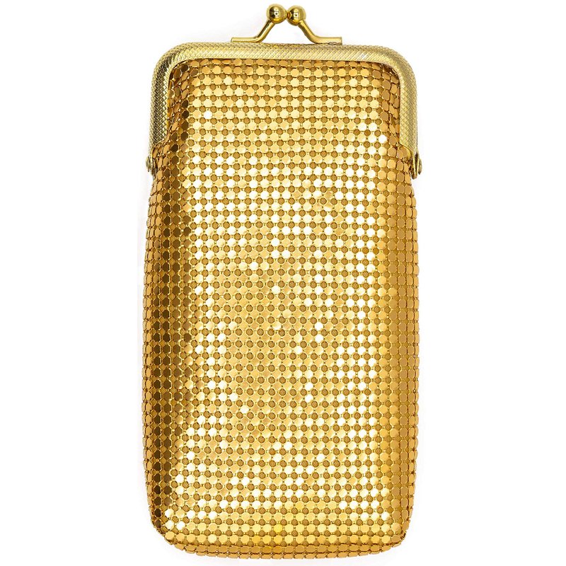 This Gold mesh cigarette purse has a sleek padded silk inner layer that accentuates the shine of the outer mesh casing. This cigarette purse will hold a full pack of 100s or Kings size cigarettes. Kiss lock clasps keep the purse sealed and contents secured inside.