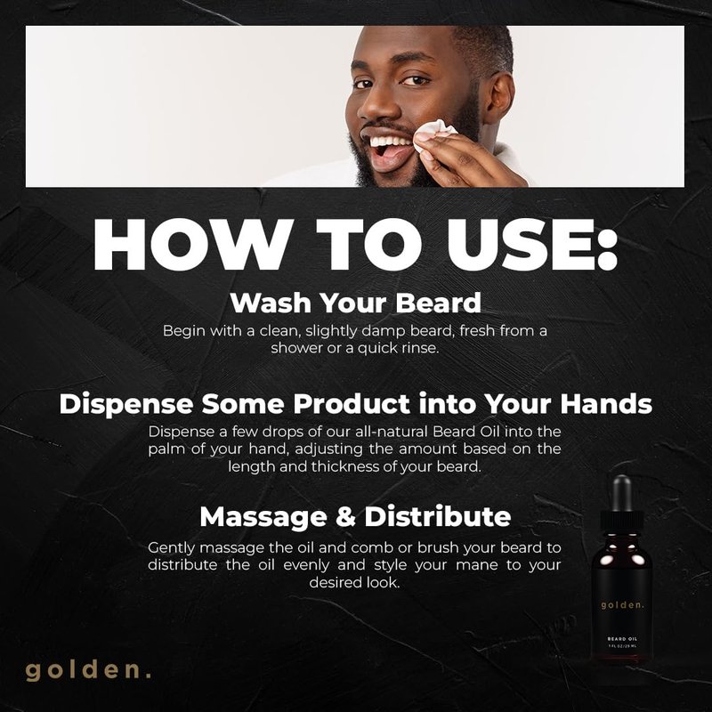 Introducing Golden Grooming Co. Beard Oil, the ultimate nourishment your beard deserves. Crafted with care, our Beard Oil is designed to keep your facial hair healthy, vibrant, and irresistibly soft. Say goodbye to unruly whiskers and hello to a well-groomed, neat appearance. Our Beard Oil effortlessly tames frizz and flyaways, ensuring that your beard always looks its best. Whether you sport a subtle stubble or proudly display a full beard, our Beard Oil offers the perfect solution to maintain a luscious, well-groomed look. But our Beard Oil is more than just a grooming essential - it's an experience. Immerse yourself in a captivating scent that adds a unique charm to your persona, making you unforgettable. With every application, our carefully crafted formula leaves a subtle, intoxicating fragrance that lingers throughout the day. Each bottle of Golden Grooming Co. Beard Oil contains 1 oz., offering a month's supply of beard care goodness. Our oil is carefully formulated using a blend of nourishing ingredients that promote healthy hair growth and a soft, touchable texture. Take your grooming routine to the next level with Golden Grooming Co. Beard Oil. Experience the difference as your beard transforms into a symbol of pride and sophistication. Give your facial hair the attention it deserves and let our Beard Oil become your trusted companion on your journey to a well-maintained, exceptional beard.