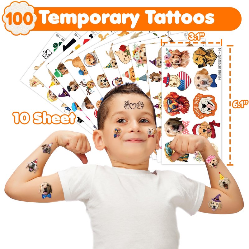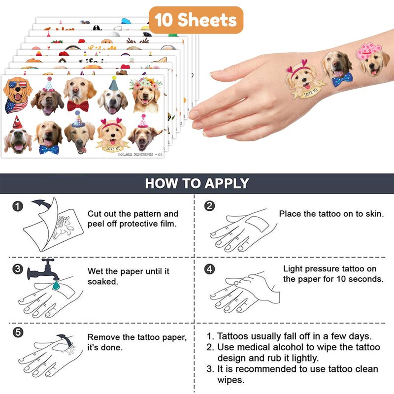 - 🐶 [PERFECT TATTOOS FOR THEMED GOLD RETRIEVER]: If you're captivated by the charm and adorable nature of Dachshunds, our set of temporary Gold Retriever tattoos will leave you in awe. With 10 sheets featuring a total of 100 exquisite and charming designs, our collection is a must-have for Gold Retriever enthusiasts of all ages. Each sheet measures 6.1 * 3.1 inches, allowing both kids and adults to show their love for Gold Retriever.