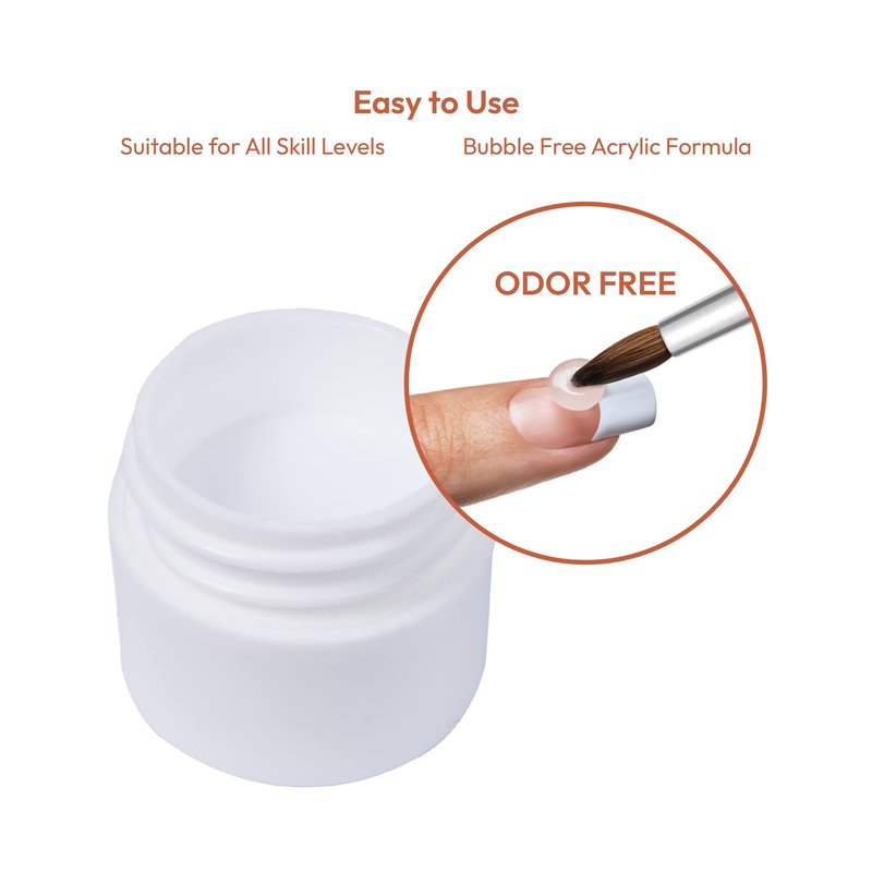 - KIT CONTAINS- The kit contains 1 PC of EMA Acrylic Liquid (0.50 FL oz) and 1 PC of Acrylic Powder (0.25 oz). The odor-free formula is ideal for individuals with sensitivities to strong chemical smells.