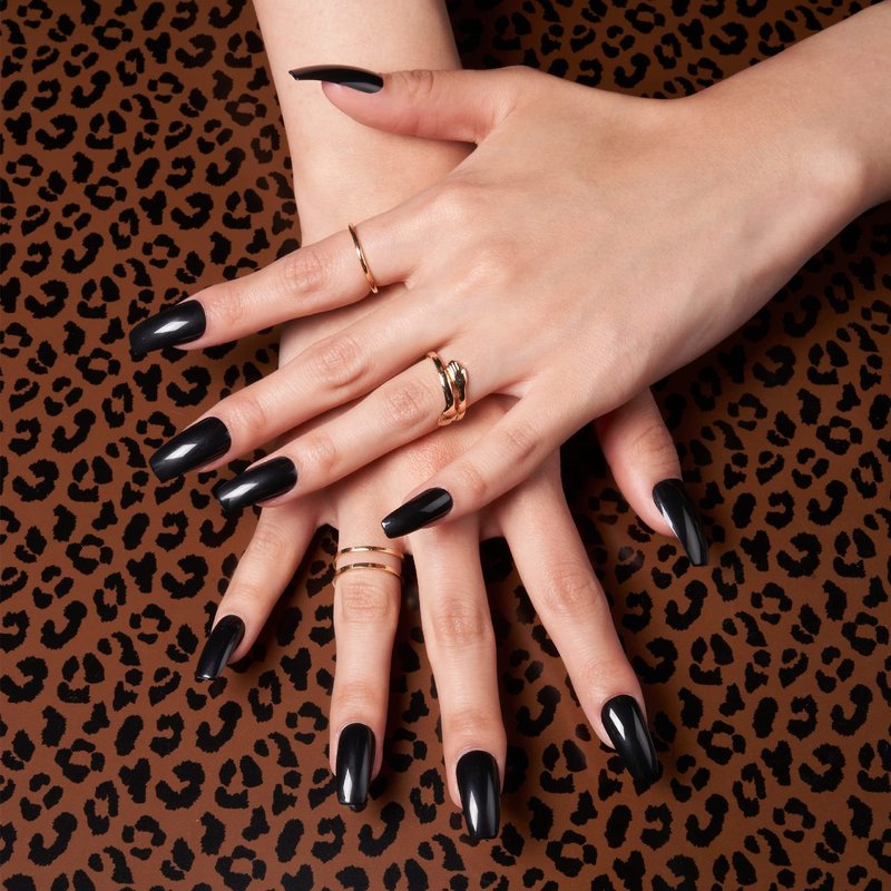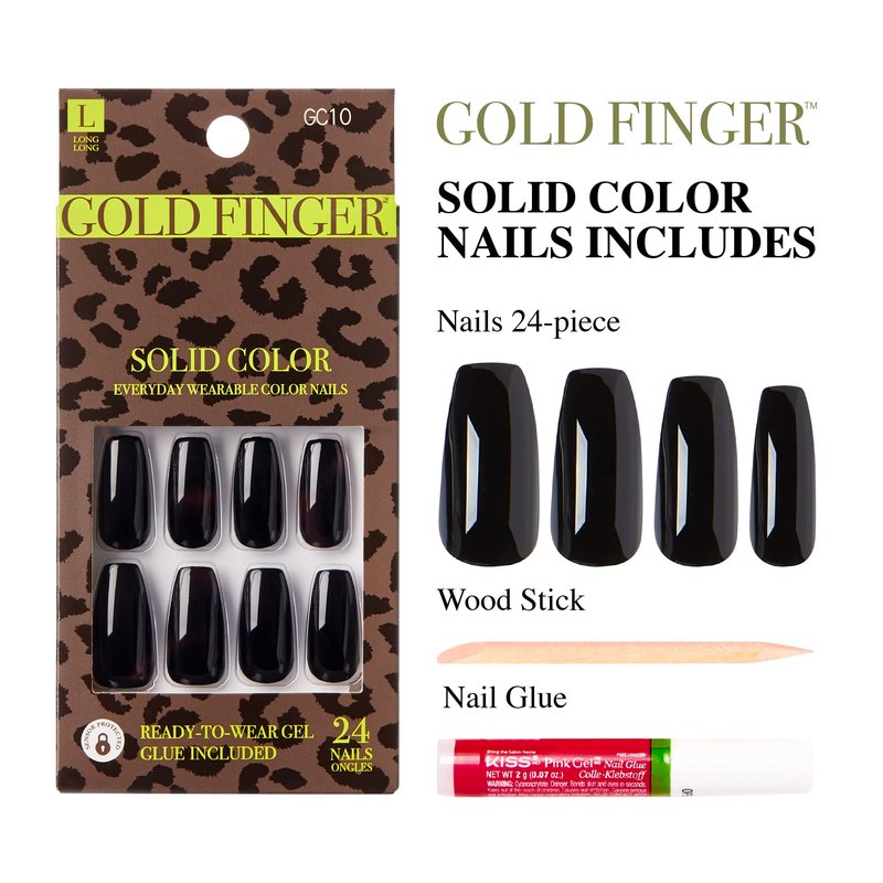 GoldFinger Press On Full Cover False Nails Kit with Glue, Solid Color Black Nails, Ready to Wear Gel, Medium, Long Length Nails (Crisp Air)