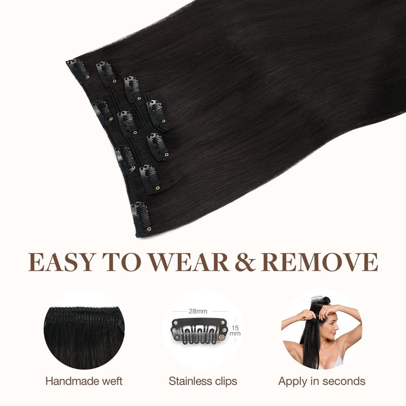 - High-Quality Clips for Quick Wear: Our clip in extensions boast slim, silicone-backed clips for a barely-there feel, securely stitched and cushioned with gentle rubber to safeguard your scalp and hair. The PU design makes the seamless clip in hair extensions more invisible, comfortable, natural, and lighter. They're a breeze to self-apply and remove, perfect for effortlessly transforming your look for any event, from weddings to parties to date nights.